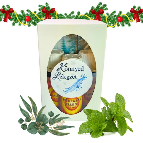 "Könnyed lélegzet" aromaterápiás illóolaj szett 3 x 10 mlBORSMENTA illóolaj:A borsmenta friss és édes illata bejárja otthonodat, emeli kedvedet a hideg téli napokon. Érzékeid felélénkülnek, a légutaid kitisztulnak, és egy pillanat alatt könnyedebbnek érezheted magad. EUKALIPTUSZ illóolaj:Az eukaliptusz erőteljes és tiszta illata mint egy friss fuvallat a téli erdőből, seg