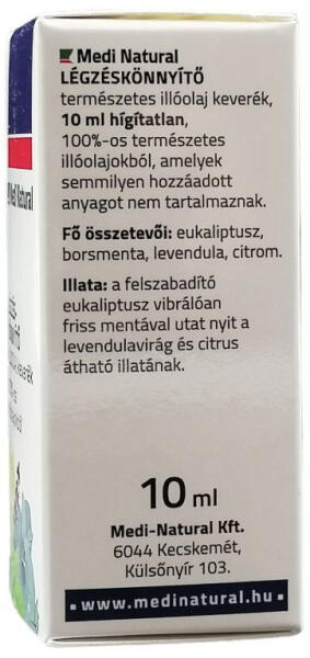Eukaliptol és mentol tartalmánál fogva belélegezve a légutakban kellemes friss érzetet kelt elősegíti a légutak átjárhatóságát, a könnyedebb légzést. 10 ml-es illóolaj keverék; Medinatural termék aromaterápiához.