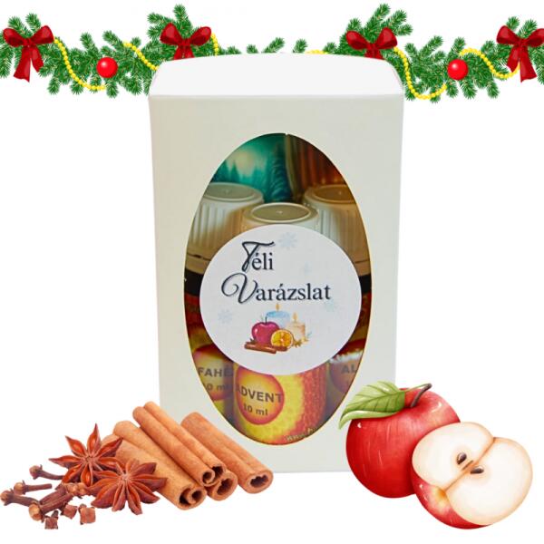 "Téli varázslat" aromaterápiás illóolaj szett 3 x 10 mlADVENT illóolaj:Ez a hangulatos téli illatkeverék a fahéj összetéveszthetetlen aromájával az ünnepi várakozás báját és varázsát hozza el otthonodba. Engedd, hogy a fűszeres és gyümölcsös jegyek felkészítsenek a karácsony ünnepi pillanataira. ALMA illóolaj:Ez az illat nem csak a természet bőségét hozza el otth