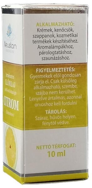 Neuston természetes illóolaj citrom 10 ml Antibakteriális , antivirális , antiszeptikus , lázcsillapító hatása miatt megfázás, légúti panaszok esetében is védelmet nyújt. Visszérpanaszok, valamint zsíros pattanásos bőr esetén is jól alkalmazható érszűkítő , mikrocirkulációt fokozó hatása miatt. Párologtatva a szoba levegőjének frissítésére, szagtalanítására,