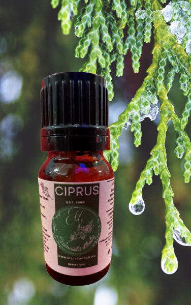 Eredet: Mediterrán térségben őshonos ciprusfa leveleiből és gallyaiból készül. Hatás: Nyugtató, légúttisztító, összehúzó hatású, segíthet a vérkeringés javításában és a duzzanatok csökkentésében. Felhasználás: Masszázsolajokban, fürdővízben relaxációra, diffúzorban légzőrendszeri problémák enyhítésére.
