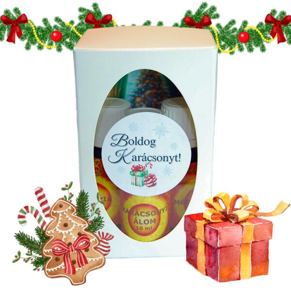 "Boldog Karácsonyt" aromaterápiás illóolaj szett 3 x 10 mlKARÁCSONYI ÁLOM illóolaj:A frissen vágott tűlevelű fenyők, a fűszeres fahéjés a friss narancshéj jegyeként ragyogó meséskarácsonyi illóolaj lendületet és meghittséget áraszt körülötted. Az elbűvölő fenyőillat és a finom, bizsergető melegség együtt táncol, hogy megidézze az ünnep meghitt hangulatát, meg