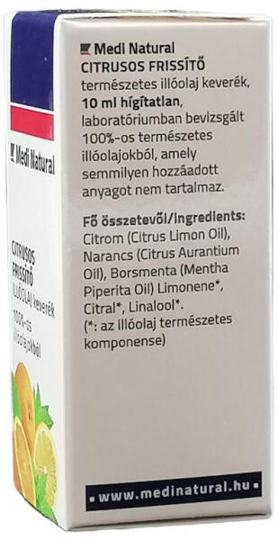 Frissítően tiszta citrom, narancs vidámságával és egy csepp harmatos mentával vérpezsdítő atmoszférát teremt bárhol. 10 ml-es illóolaj keverék; Medinatural termék aromaterápiához.