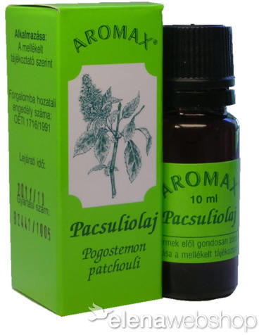Aromax Pacsuli Illóolaj 10 ml Illat: édeskés, pikáns, földszagú Javasolt alkalmazás: párologtatásra, bőrnyugtató borogatáshoz, szájvíz készítésére Elterjedés, természet, előállítás: A kínai és indo-maláj elterjedésű Pogostemon nemzetség 40 faja közül legfontosabb a pacsuli (P. cablin). Kedvelt lágyszárú vagy cserjeszerű illatszernövény, melynek őshazája a F