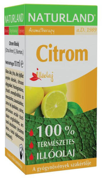 Naturland Illóolaj Citrom 10 ml llata: üde, friss, éles fejillat enyhén édeskés, citrusos aljegyekkel. Alkalmazási módok: párologtatás, frissítő aromafürdő, frissítő masszázs, szaunázás, zsíros haj ápolása, zsíros, pattanásos arcbőr tisztítása Jellemzők Citrusos jegy 100% tiszta, természetes illóolaj. Párologtatásra, frissítő aromafürdőhöz, frissítő masszázs