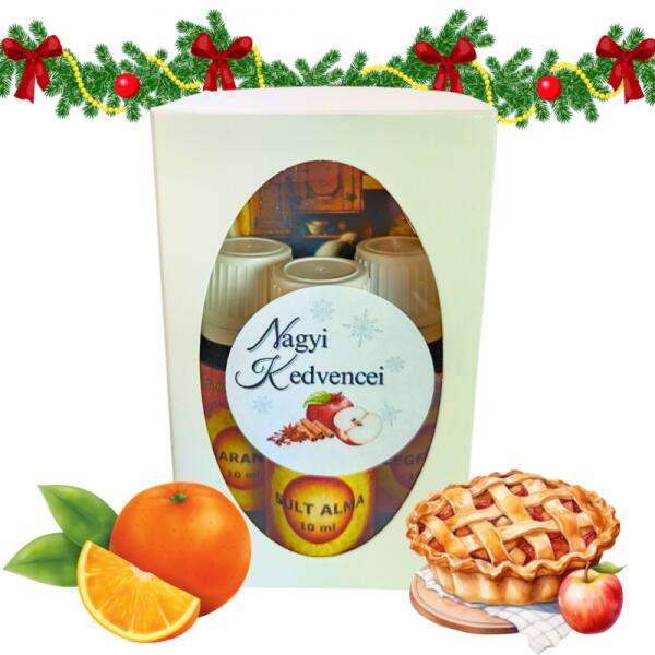 "Nagyi kedvencei" aromaterápiás illóolaj szett 3 x 10 mlSÜLT ALMA illóolaj:Ebben az illatban az alma frissessége és a fahéj melegsége olvad össze, megteremtve ezzel egy barátságos és meghitt atmoszférát. Mint egy meleg almás pite, ez az illat azonnal otthonossá és kényelmessé teszi a teret, ahol éppen tartózkodsz. NARANCS illóolaj:A narancs édes és frissítő illata olyan,
