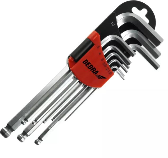 9 darab hosszú, gömbvégű, "mbus" néven ismert, hosszú hatszögletű kombinált hatlapos csavarkulcs készlet. A gömbvég c lehetővé teszi a nehezen hozzáférhető helyeken történő munkát. A kulcsok krómötvözött acélból készülnek, amely rendkívül ellenálló a korrózióval szemben. A kulcsok kényelmes és tartós fogantyúhoz vannak rögzítve a gyors hozzáférés érdek