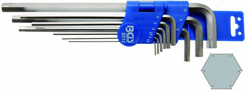BGS Technic - Germany Speciális, egyedi kialakítású imbuszkulcs készlet, kifejezetten a lesarkalt Belső Kulcs Nyílású (BKNY) imbusz csavarokhoz lett kifejlesztve. Ennek a készletnek a használatával lehetőségünk nyílik az imbusz csavarok megsérült (elkerekedett) belső kulcs nyílásának ellenére a csavarok kitekerésére. A speciális kialakítás az "L" alakú imbuszkulcsok mi