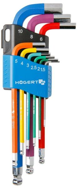 HÖGERT Imbuszkulcs készlet, színkódolással, gömb alakú vég, 9 db-os, 1,5-től 10 mm-es méretig (HT1W806) Termék információ: Anyaga : S2 nemesacél Méret: 1,5 - 10 mm 9 db-os imbuszkulcs készlet hatszögű keresztmetszettel, színkódolással, mely garantálja a méret gyors azonosítását 1,5 mm, 2 mm, 2,5 mm, 3 mm, 4 mm, 5 mm, 6 mm, 8 mm, 10 mmm Gyors deformációra és kopásra el