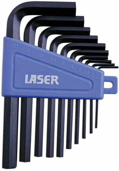Laser Tools - UK 10 darabos készlet: 1,5 - 10 mm-ig Normál méretű "L" alakú imbuszkulcsok, kék műanyag tároló tokban. Méretek: 1,5 - 2 - 2,5 - 3 - 4 - 5 - 5,5 - 6 - 8 - 10 mm Anyaga: Chrome Vanadium acél Felülete: feketített