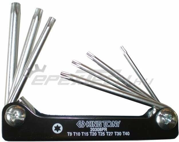 King Tony kihajtható torx kulcskészlet 8db-os kerékpárhoz Anyaga: SNCM + V ötvözött acélból, felület: krómozott. Méretek : T9 , T10 , T15 , T20 , T25 , T27 , T30 , T40