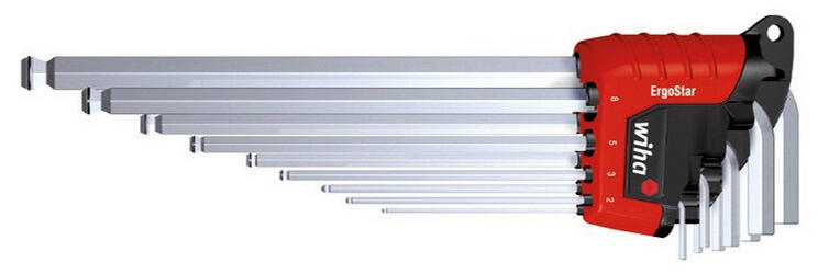 WIHA ErgoStar MagicRing gömbvégű imbuszkulcs készlet, hosszú, 9db-os Jellemzők Hosszú élettartamú és kiváló minőségű krómozott felületű imbuszkulcs A szerszám kivétele és meghatározott helyzetben való behelyezése a tartóba gyerekjáték A gömbfej könnyebbé teszi a hozzáférést a csavarokhoz és segítségével akár 25°-os szögben is dolgozhat A Wiha MagicRing® tar
