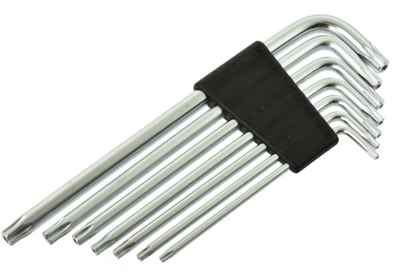 A termék jellemzői: Hőkezelt króm-vanádium ötvözött acél A lekerekített élek lehetővé teszik a könnyű rögzítést a rögzítőelemekre A csuklós tok laposan nyílik A hosszú karú kulcsok extra nyúlást és nagyobb nyomatékot biztosítanak A dobozon feltüntetett méretek a gyors méretválasztáshoz A készlet 7 darab hosszú karú Torx kulcsot tartalmaz: T10, T15, T20, T25, T
