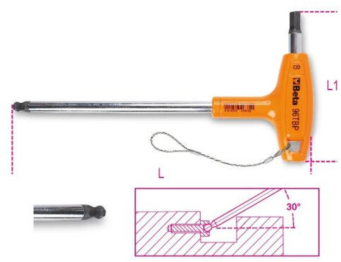 Tulajdonságok Hajlított gömbfejű imbuszkulcsok nagy nyomatékú T-markolattal, H-SAFE A gömbfejnek köszönhetően a csavar tengelyéhez képest 30°-ban is dolgozhatunk A hagyományos imbuszkulcsokhoz képest nagyobb teljesítmény Kalibrált hatszög kialakítás biztosítja a tökéletes illeszkedést Az ergonomikus markolat még szűk helyen is jó meghúzást biztosít