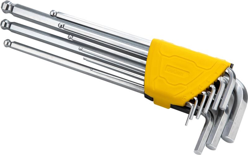 A Ceta Form 9 részes gömbvégű imbuszkulcs készlet tartalmának méretei 1,5; 2; 2,5; 3; 4; 5; 6, 8; 10 mm. Króm-molibdén-vanádium acélból készült fényes nikkelborítású, melegen edzett a könnyebb behelyezés érdekében rovátkolt 90 fokos hajlítást speciális gépeken végzik, mellyel megelőzik a deformációt és így növelni tudják az élettartamot. A termék barkácsolók