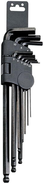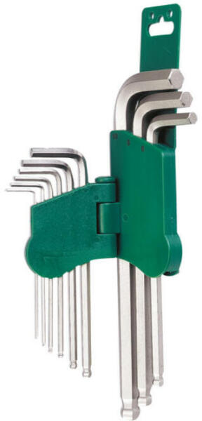 Imbuszkulcs készlet gömbfejű véggel 9 db-os CrV acélból 1,5-10 mm A 9 darabos imbuszkulcs készlet kiváló minőségű, teljes hosszában keményített króm-vanádium (CrV. ) acélból készült. Gömbfejben végződik, ez által könnyen végezhet 30°-os szögben munkálatokat. Az imbuszkulcs L-alakja biztosítja a kifejtett erő optimális kihasználását és elősegíti a könnyű és