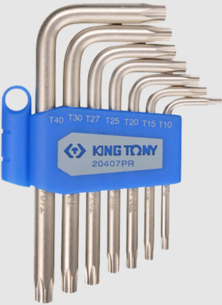 King Tony torx kulcs készlet furatos 7db-os King Tony 20407PR torx kulcs készlet furatos kiképzés - speciális és sima torx fejű csavarokhoz. Tartalma: T10, T15, T20 , T25, T27, T30, T40 Hossz: 50mm - 96mm-ig Anyaga: SNCM + V ötvözött acél, felületkezelés: krómozás. Műanyag tartóban.