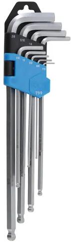 Leírás hosszú oldal gömbfejjel praktikus tartóban Szállít si terjedelem: Deréksz ögű kulcs, belső hatszögletű kihajtófej/ gömbfejes belső hatszögletű 1/16", pengehossz (rövid oldal): 17 mm, pengehossz (hosszú oldal): 95 mm 5/64", pengehossz (rövid oldal): 19 mm, pengehossz (hosszú oldal): 105 mm 3/32", pengehossz (rövid oldal): 22 mm, pengehossz (hosszú oldal): 115 mm 1/8",