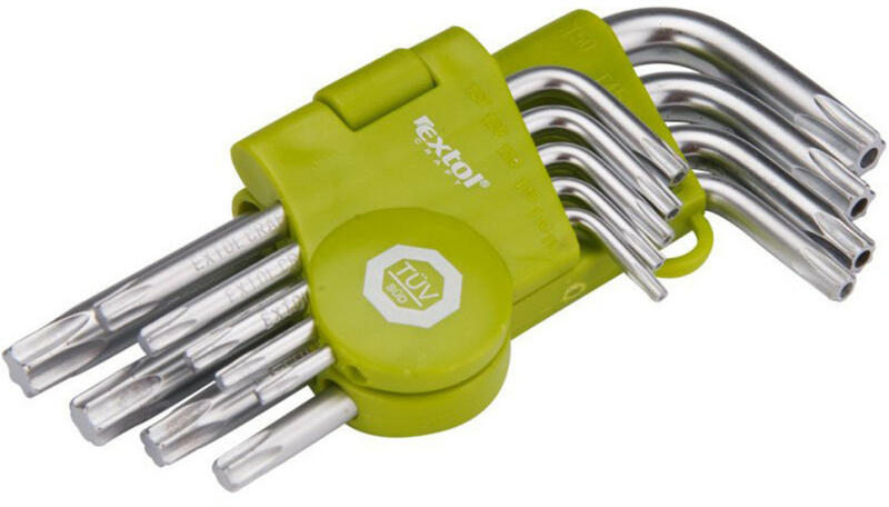 Torx - lyukas torx kulcs készlet, CrV T10-T50 A 9 darabos kulcs készlet jó minőségű CrV acél (króm-vanádium) alapanyagból készült. A kulcsok L-alakja biztosítja a kifejtett erő optimális kihasználását és elősegíti a könnyű és egyszerű munkavégzést. Méretek: Hosszabb száron (torx TX): TX 10 TX 15 TX 20 TX 25 TX 27 TX 30 TX 40 TX 45 TX 50 Rövidebb száron (lyukas torx T