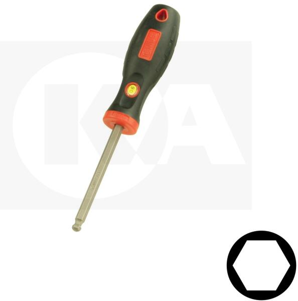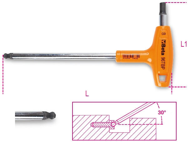 Edzett karbonacél kettős anyagú T-markolattal a nagyobb kényelem és erő érdekében. A gömbvégű hatszögkulcs max. 30°-os szögelfordulást tesz lehetővé. A rövidebb hatszög véget akkor használjuk, ha nagyobb szorítónyomaték szükséges. A hosszú hatszög gömbvégű míg a rövid hatszög egyenes. Feketeoxidált felület. Gyártva az ISO2936/DIN911 szabványok előírásai sze