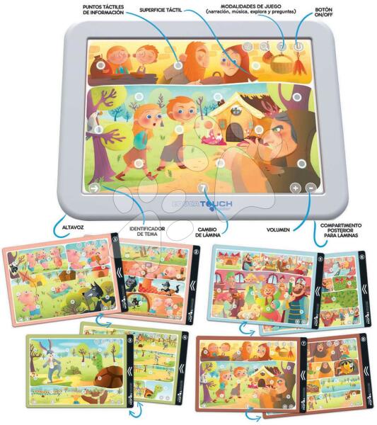 Elektronikus táblagép Nuevo Cuentacuentos a spanyol Educa vállalat műhelyéből egy igazán csodás gyerekjáték 2-6 éves korosztály részére. A gyerekeknek szánt táblagép interaktív képekkel ellátott kártyák alapjául szolgál, amelyek mindegyike egy-egy eredeti történetet jelenít meg. Gyerkőcökre 12 interaktív kártyalap vár 4 mesével: A három kismalac, Teknősbéka és