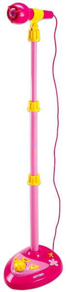 Színes színpadi mikrofon, állítható magasságú állvánnyal és effektekkel. A mikrofonba simán tudsz énekelni, de a különböző effektgombokra lépve akár torzítani is tudod a hangod, illetve a hangerőt is tudod szabályozni. Ha nem énekelsz, a mikrofon kis idő elteltével kikapcsol magától. A játék fényeket is ad ki magából, illetve 10 különböző demó dalt tud lejátsza