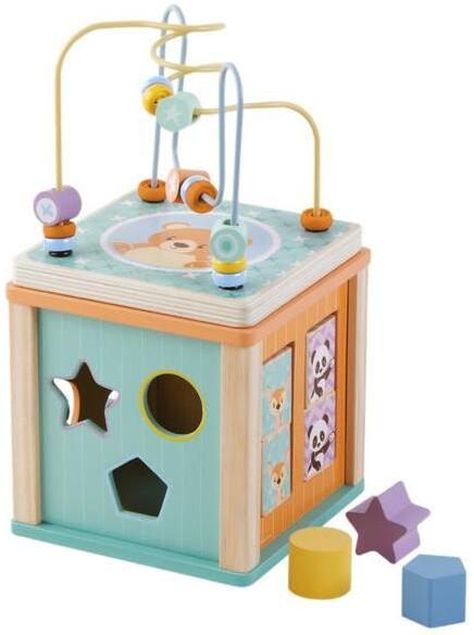 Az Activity Cube játszva fejleszti a kicsik készségeit. A kocka minden oldalán más-más feladatok vannak. Formabedobó, tekerheto fa fogaskerekek, forgatható lapocskák és hullámos sínpálya, tetején pedig egy golyóvezeto játék kapott helyet. A fa készségfejleszto kocka édes kis állatokkal van dekorálva, amelyek további játékra ösztönzik a kicsiket. A játék fejleszti a gye