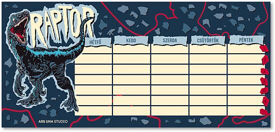 Ars Una dinoszauruszos órarend - Raptor Kétoldalas órarend Az Ars Una órarend kétoldalas, így A és B hét órarendje felvezethető rá, a hét öt napján, napi 7 tanóra rögzítésére alkalmas, segítségével biztosan nem felejted otthon a füzeteidet és tankönyveidet. Az órarend dinoszaurusz mintás, Raptor felirattal. Az órarend az iskolafelszerelések alapvető eszköze. Méret:
