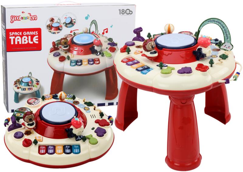 Interaktív oktatási panel asztal zongora dob piros Az oktatóasztal kiváló játék, amely nemcsak szórakozást nyújt, hanem támogatja a gyermekek kognitív és manuális fejlődését is. A panelen egy állatmotívum látható, ez az asztal interakcióra és felfedezésre ösztönzi a gyerekeket. Az asztal három lábon áll, ami biztosítja a stabilitását, de közvetlenül a padlón is h