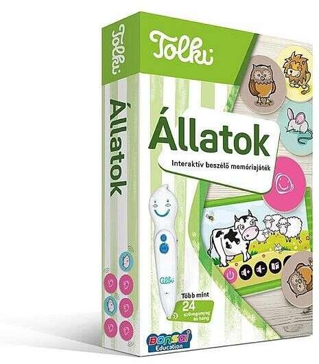 Tolki Interaktív beszélő memóriajáték - Állatok Memória játékA klasszikus memóriajáték egy kicsit másképp. Kiváló fejlesztőjáték kicsiknek és nagyobbaknak, ami többféle módon is játszható. Interaktív toll segítségével nemcsak a vizuális memóriát hanem a hang alapján történő felismerést is fejleszti. Tartalma: 48 db memóriakártya 2 kártya szabályokkalFONTOS