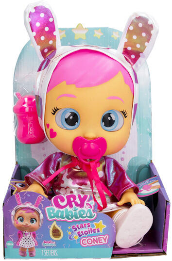 Cry Babies Stars Coney A csillagok közül érkezett a Cry Babies Stars Coney baba, hogy elhozza az űr csodáit közvetlenül a gyerekszobába! Ez a különleges baba, aki minden gyermekkel szeretne játszani, egy szupermenő, új irizáló ruhában és hozzá illő cipőben érkezik, készen állva, hogy a divat csúcsát képviselje a játékok világában. Amikor a gyerekek kiveszik Coney cumi