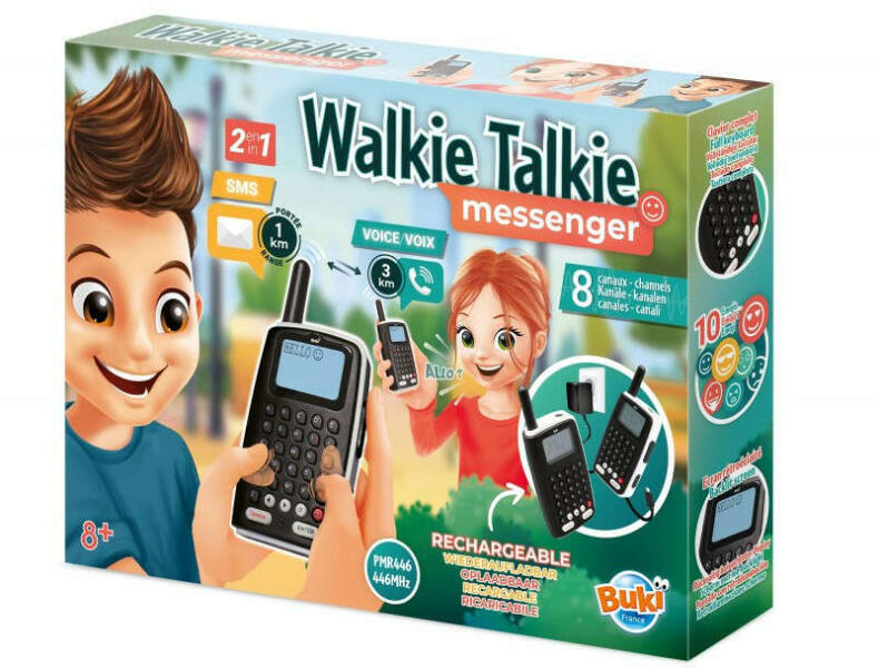 Játék walkie-talkie szett gyerekeknek, kiegészítő szöveges üzenet funkcióval; Hatótávolság akár 3 km! Több funkció: 8 használati csatorna, különböző csengő hangok, beépített zseblámpa, megvilágított képernyő. Szöveges üzeneteket lehet fogadni és küldeni a másik felhasználótól/felhasználónak. Tartalma: 2 walkie takie, dugó, hálózati adapter, újratölthető e