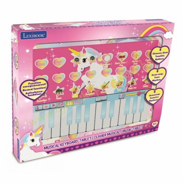 Lexibook Egyszarvú zenélő billentyű tablet a legkisebb zenekedvelők számára. A gyönyörű egyszarvúval díszített játékkal nem csak kedvenc dalaitokat tudjátok megszólaltatni, hanem akár fel is vehetitek őket 60 másodperc erejéig. A PLAY gomb megnyomásával vissza is tudjátok hallgatni a zenerészletet. A terméket 3 éves kortól ajánljuk. A játékra 2 év gyártói garancia
