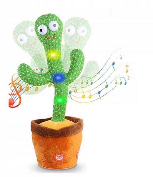 Az aranyos és vicces kaktusz plüssjáték táncol, énekel, mozog és szavakat ismétel. Az éneklő és táncoló kaktusz plüss anyagból készült. A játék ritmusra táncol, és felkelti a gyermek figyelmét. Lejátszás/ismétlés funkció. LED fényhatások. Magasság: 32 cm.