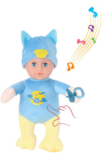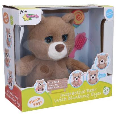 Interaktív medveled. Ülő méret 27 cm. Hanghatások és pislogás a bal kéz megnyomásával és tárgyak hozzáérintésével vagy más testrész (fej, orr - tüsszentés, mellkas - nevetés) megnyomásával. 3x gyors érintés a fején - becsukja a szemét és alszik. Pálcika és hal hozzáérintése a szájához - evés. 3xAA elem tartozék. On/off/try me kapcsoló a fej hátsó részén. F