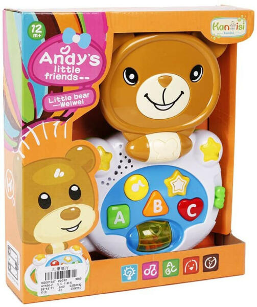 Andy kicsi Maci barátja bébi zenélő játék Andy kicsi Maci barátja bébi zenélő játék . Ezzel a baba játék kal könnyen megvalósíthatod babád fejlesztését. Hangokat ad ki, méghozzá állatok hangjait, közlekedési hangokat, emellett 26 féle dallamot játszik. Az ABC betűit is megtanulhatja vele a gyermek. A bébi zenélő játék jellemzői: Anyaga: műanyag 12 hónapos kor fe