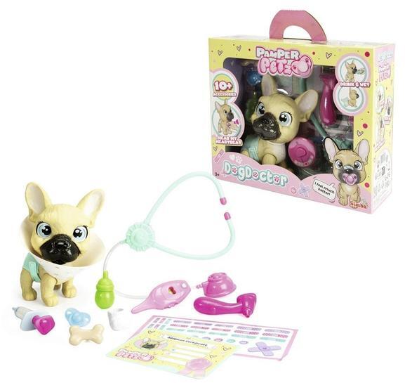 A Pamper Petz állatorvos szett kutyával a pelenka bandából, tökéletes azoknak a gyerekeknek, akik kisállatról szeretnének gondoskodni. A bájos francia bulldog gyorsan minden felelősségteljes és kutyaszerető óvodás napi játéktársa lesz! Az interaktív kiskutya iszik és pisil - akár egy igazi kutya! Adjon neki egy italt az üvegből, majd ellenőrizze, hogy a kutyus benedvesíte