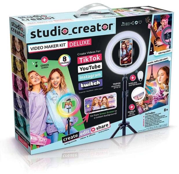 A Canal Toys 3 az 1-ben videókészítő készlet tökéletes megoldás a kreatív gyerekek és fiatalok számára, akik szeretnének saját videókat készíteni. A készlet tartalmaz egy állítható LED körfényt, amely 8 különböző színben világít, egy háromlábú állványt, amely akár 1 méter magasra is állítható, valamint egy 2x2 méteres zöld hátteret, amely lehetővé teszi