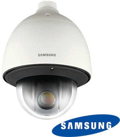 SAMSUNG kültéri vandálbiztos nagydinamikájú mechanikus Day&Night 1.3 megapixeles IP PTZ Dome kamera, 1/4-os Progressive CMOS chip, SXGA (1280x1024 pixel) felbontás, 0.5lux/F1.4 minimális megvilágítás, integrált LINUX operációs rendszer, H. 264 / MJPEG video tömörítések, G. 711 / G. 726 hangtömörítés, max. 60fps képfrissítés (h. 264 tömörítéssel), LAN csatlakozás, I