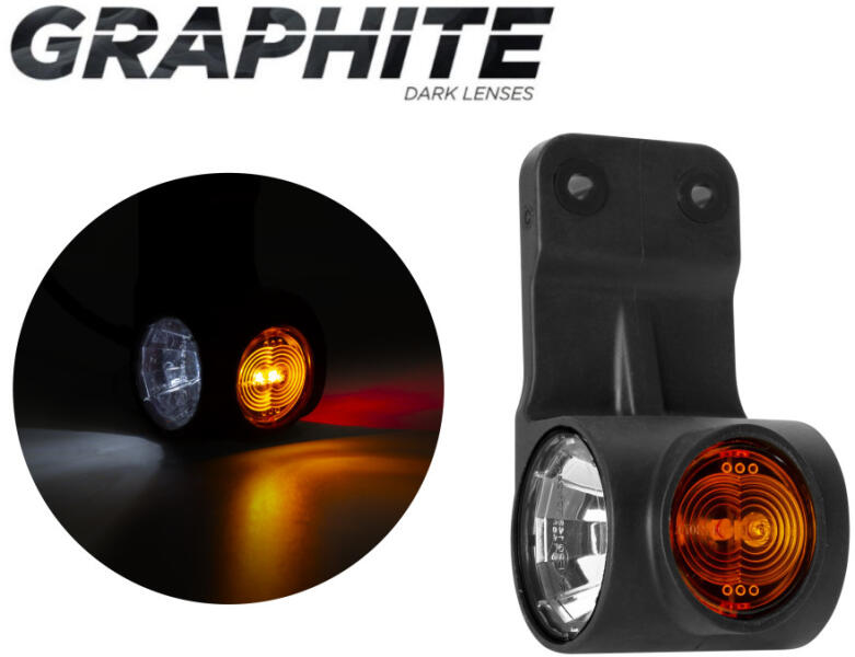 Függesztett kivitelű LED helyzetjelző gumilámpa BAL oldalra. Flexibilis gumi felfüggesztése véd a kisebb sérülések ellen. Sötét füst színű (GRAFIT) búrája egyedi megjelenést kölcsönöz. Háromszínű, előre fehér, hátra piros, oldalra sárga fénnyel világít. Speciális foncsorja megnöveli a fénykibocsátó felületet (nem csak pontszerűen világít). Feszültség: 12 /