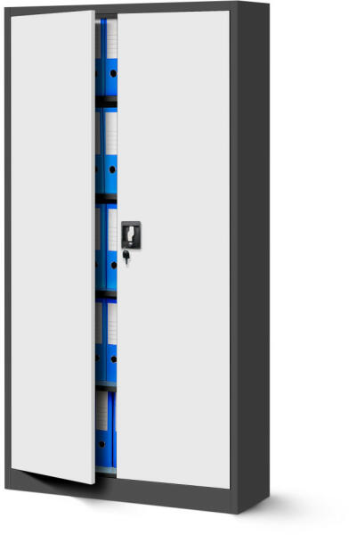JAN fém iratszekrény antracit-fehér színben Kiválóan alkalmas minden munkahelyi környezetben (iroda, orvosi rendelő, szerelőműhely) 50 darab különböző pozícióban elhelyzető polcok 3 ponton záródó ajtók (2 db kulcs a készletben) 0,6 mm vastagságú porszórtan kezelt felületű minőségi fém lapokból áll 4 darab 25 mm vastag polcok, melyek egyenként 50 kg-os terhelést is
