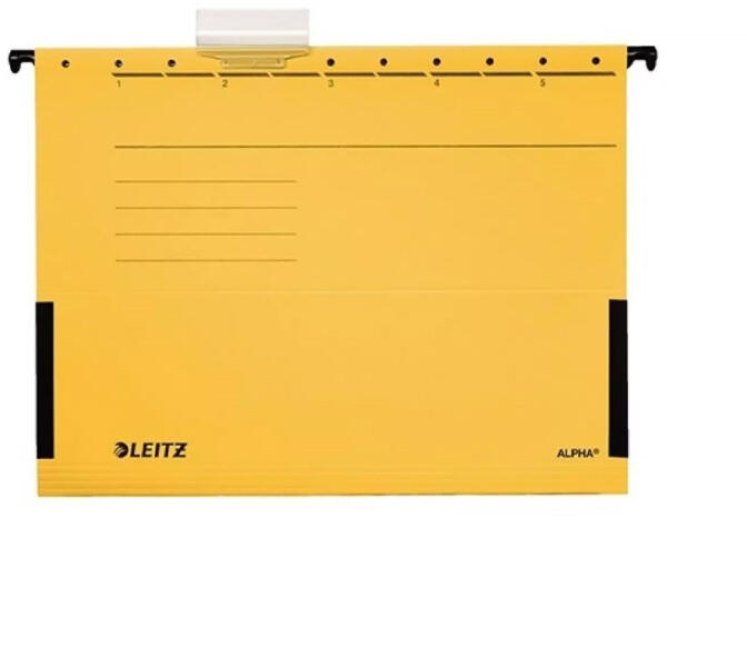 FÜGGŐMAPPA, OLDALVÉDELEMMEL, KARTON, A4, LEITZ ALPHA, SÁRGA Minőségi függőmappa V-alakú gerinccel - az oldalán található zsebek megakadályozzák a függőmappa tartalmát a kieséstől - zsebekkel a dokumentumok biztonságos tárolásához - erős és tartós fém fülek - a nagy méretű, erős, műanyag címketartóra akár 4 sorban is írhatunk - lyukak az elő-és hátlapon lefűz
