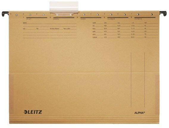 Függõmappa LEITZ Alpha Standard. Kiváló minõségű zárt függõmappa. V alak. Oldalvédelem az iratok kicsúszása ellen. Fém fülek. Méret: A/4 , 348x260x0 mm. Alapanyag: 210 gr-os karton, 100% újrahasznosított. Laminálással megerõsített gerinc. Több színben. Víztiszta, műanyag címketartó, 6 cm hosszú. Változtatható címkeállás. Fehér címke 100%-ban újrahasznosított k