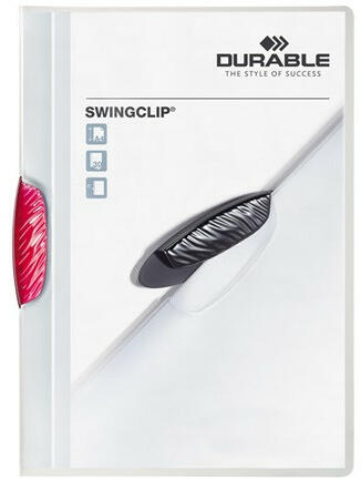 Clip-mappa Durable Swingclip A/4 30 lapig kárminvörös Méret: A/4 Lapkapacitás: 30 lap Szín: világospiros strapabíró PP anyagból készült klipes gyorsfűző áttetsző előlap, szürke hátlap, színes klip 30 lap lyukasztás néküli lefűzésére alkalmas