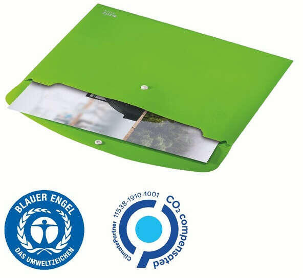 Prémium minőségű, zárható irattartó A4 méretű dokumentumok számára. 100%-ban újrahasznosított műanyagból, klímasemleges, 100%-ban újrahasznosítható Blue Angel tanúsított termék. Szemet gyönyörködtető, prémium minőségű PP irattartó mindennapi használatra az iskolában, irodában és otthon; praktikus záródással, amely megakadályozza a dokumentumok kicsúszását.