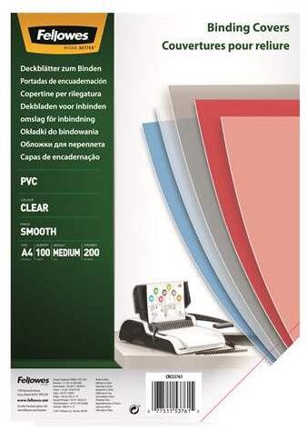 Előlap, A4, 200 mikron, FELLOWES, víztiszta - Átlátszó előlap spirálkötéshez - Méret: A4 - Vastagság: 200 mikron - Kiszerelés: 100 db/csomag - Szín: víztiszta