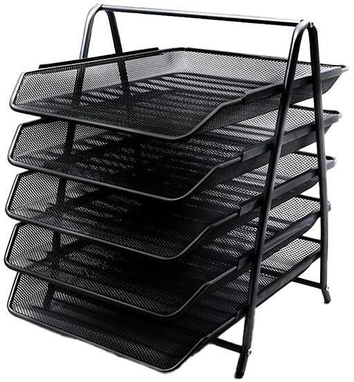 Fémhálós kivitelű ötszintes irattartó tálca, A/4 -es méretű iratok tárolására, fekete színben