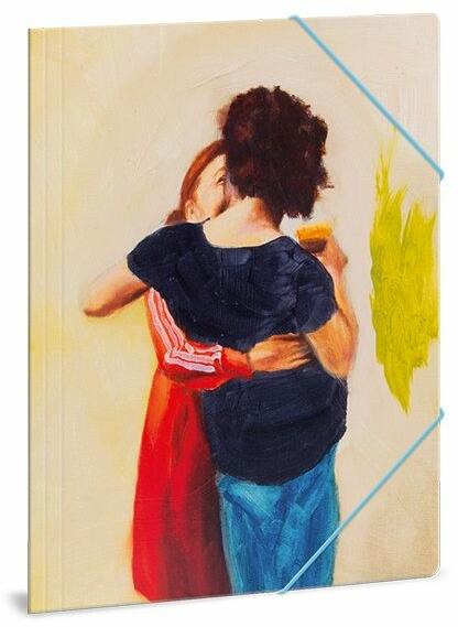 Vetlényi Zsolt festõművész grafikájával ellátott A/4 méretű gumis dosszié iratok, füzetek tárolására. 350 gr-os vastag kartonból készült dosszié lekerekített elsõ sarkokkal, színes gumi zárópánttal. Külseje négy színnel, fényes fóliával nyomott. Belsõ oldala nyomatlan.