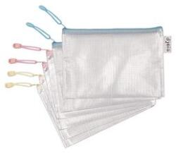 Rendkívül tartós, félig átlátszó, rugalmas hálóval erősített, tartós PVC tasak vonzó, pasztell színekben. Dokumentumok, írószerek, apró tárgyak akár tematikus rendszerezésére is alkalmas. A fém cipzáron lévő, színes zsinór megkönnyíti a használatot. Oldalán található, logós hurok toll tartására alkalmas. Formátuma: A5, külső mérete: 235 × 165 mm; tetején c