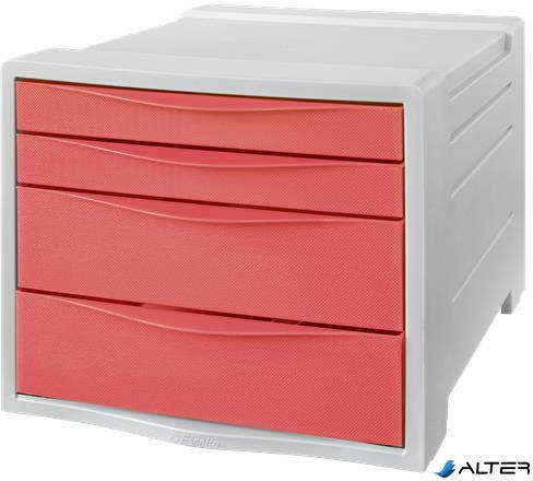 Tetszetős fiókos irattároló áttetsző színű fiókokkal és világosszürke házzal 2 magas és 2 alacsony könnyen kihúzható fiókkal a tökéletes rendszerezés érdekében Könnyen nyitható fiókok kicsúszást gátló szerkezettel a biztonságos használathoz Feliratozási lehetőség a fiókokon a dokumentumok gyors előkereséséhez A fiókok eleje zárt, így tartalmuk rejtve marad